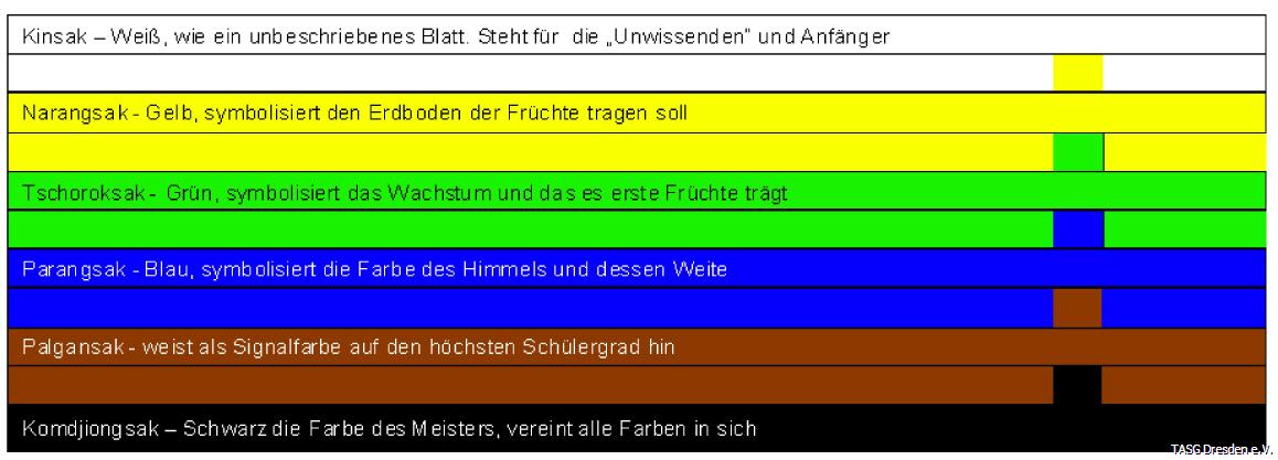 Ähnlich wie die einzelnen Formen, so haben auch die verschiedenen Farben der Gürtel ihre Bedeutung. Beginnend mit dem 10. Kup-Grad, werden die jeweils ungeraden Kup-Grade durch eine Kombination der jeweils darunter und darüberliegenden Farbe dargestellt (z:B. weiß-gelb 9.Kup)